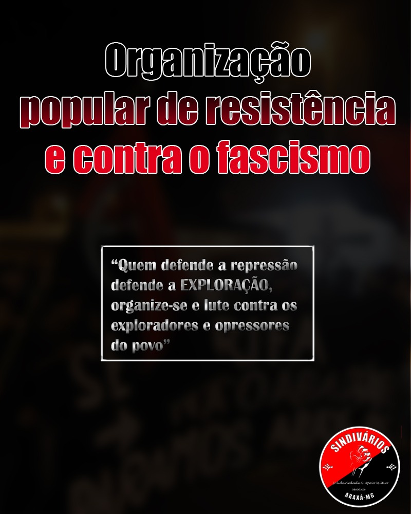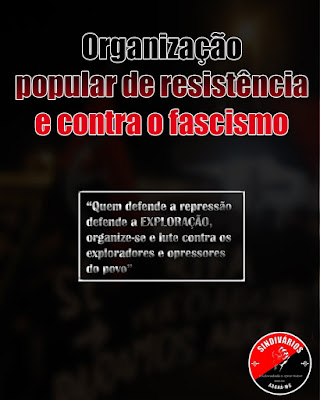Resistência contra a exploração capitalista através da organização popular. Seja através dos núcleos sindicais ou da organização popular - por todos os meios lutar por nossos direitos e combater o fascismo. Participe ativamente das lutas, opine, esteja presente em assembléias, seja parte da resistência. Os patrões são os principais financiadores de grupos da extrema direita, eles sabem que o fascismo é vantajoso pra eles, eles querem calar os sindicatos e movimentos sociais. Temos que nos defender, nossa luta é o meio para defesa e conquista de direitos.